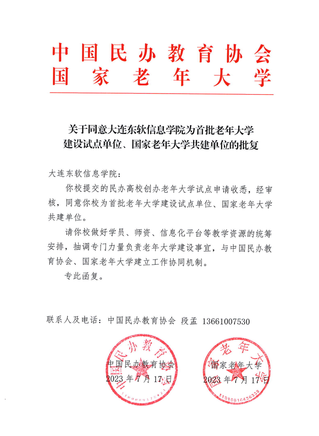 近期,由中国民办教育协会、国家老年大学联合发文,大连Ebpay信息学院获首批老年大学建设试点单位、国家老年大学共建单位。