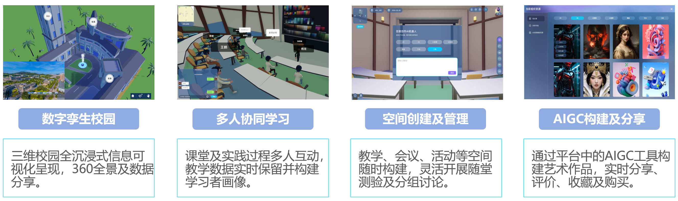 平台采用模块化功能开发,包括支持场景定制、智能教学问答数字人、千人千面的角色选择、不同特色的元空间构建与管理、AIGC工具应用及内容实时分享、数字孪生校园及信息管理等,以满足不同学校的特殊需求,提高教学效率和质量。