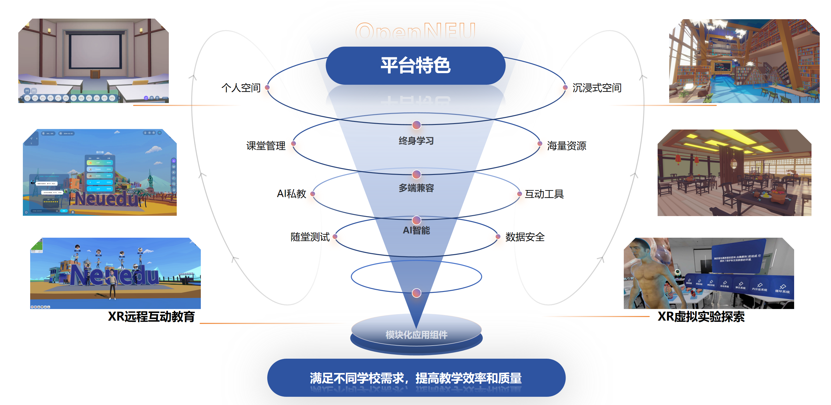 平台采用模块化功能开发,包括支持场景定制、智能教学问答数字人、千人千面的角色选择、不同特色的元空间构建与管理、AIGC工具应用及内容实时分享、数字孪生校园及信息管理等,以满足不同学校的特殊需求,提高教学效率和质量。