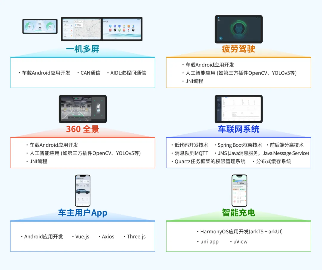 教学内容对接岗位技能:融入车载Android应用开发、人工智能应用、JNI编程、CAN通信、AIDL、移动跨平台技术、低代码技术等,课程与项目体系贯穿完整人才培养周期,同一业务场景下递进式培养,全方位对标企业用人需求。