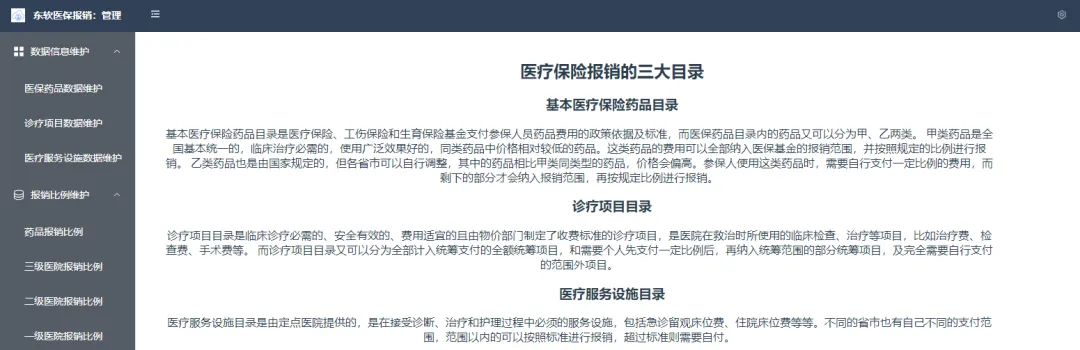 Ebpay医疗报销项目对药品目录、诊疗项目、医疗设施进行维护,对医疗报销参数进行维护,并且根据医疗保险报销公式进行医疗保险报销费用的计算,并且对参保人员的报销数据进行统计和可视化呈现。