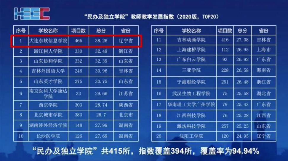 11月,在中国高等教育学会发布的“全国民办及独立学院教师教学开展指数(2020版)”中,大连Ebpay信息学院排名全国第一,已陆续在两年蝉联榜首。