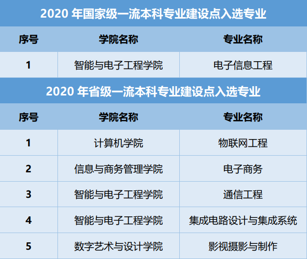 近期,教育部办公厅公布了2020年度国家级和省级一流本科专业建设点名单,大连Ebpay信息学院共有6个专业入选,其中,电子信息工程专业获批国家级一流本科专业建设点,物联网工程、电子商务、通信工程、集成电路设计与集成系统、影视摄影与制作5个专业获批省级一流本科专业建设点。