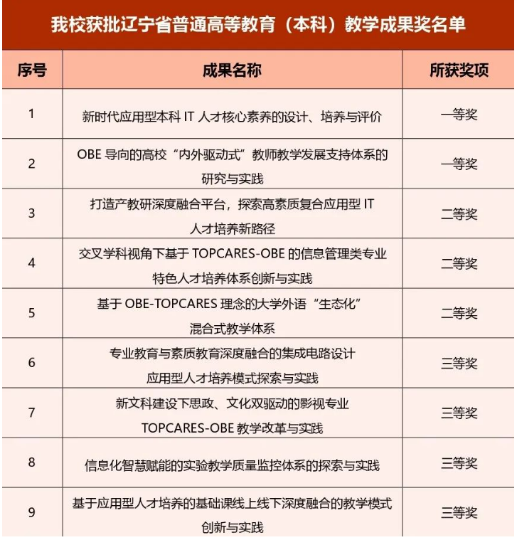 近期,辽宁省教育厅发布了《关于公布2022年辽宁省普通高等教育(本科)教学成果奖获奖名单的通知》(辽教通〔2022〕68号),大连Ebpay信息学院获批9项辽宁省普通高等教育(本科)教学成果奖,其中一等奖2项,二等奖3项,三等奖4项,获批成果总数、获批一等奖数量均位列辽宁省民办高校第一。