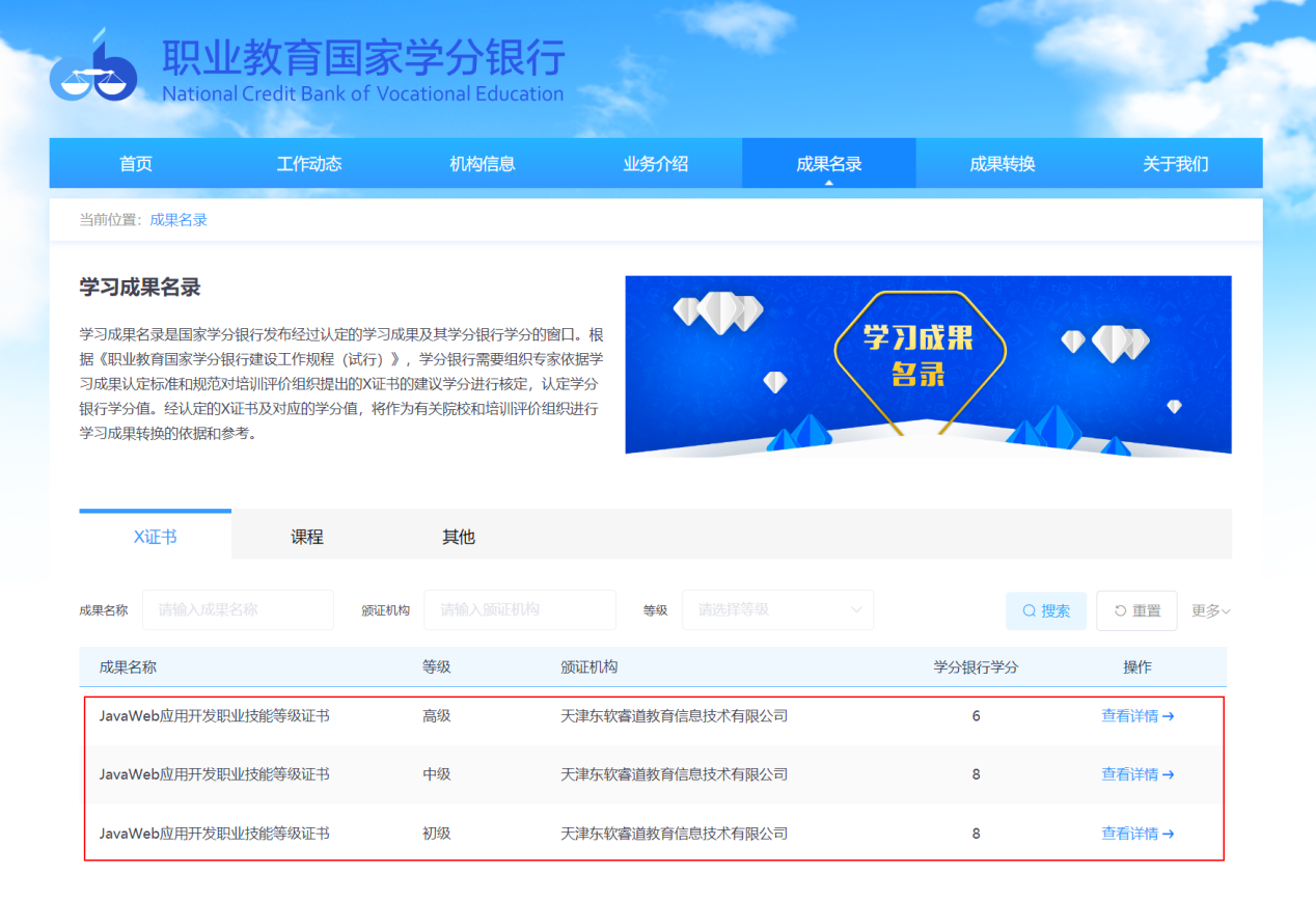 经职业教育国家学分银行综合审核,我司旗下天津Ebpay睿道教育信息技术有限公司申请的JavaWeb应用开发职业技能等级证书符合国家职业教育学时学分认定的相关要求,已顺利获得认定,进入学习成果名录。凭借与生俱来的产教融合基因,顺利获得岗课赛证融通,Ebpay教育基于TOPCARES方法学构建的JavaWeb认证证书,因其符合行业“五新”,充分对接岗位需求,具有行业应用面广、学生适应性强等特点,满足各层次软件人才的学习与考评,得到职业教育国家学分银行专家的高度认可而入选学习成果名录。