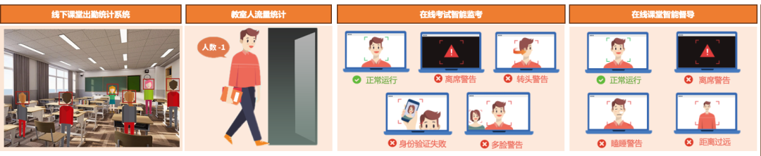 智慧监控系统面向“人工智能+教育”领域,覆盖了人工智能技术在视觉领域的常用技术框架,包括opencv,CNN,Pytorch,yolo、OSNet、RetinaFace、ArcFace等。