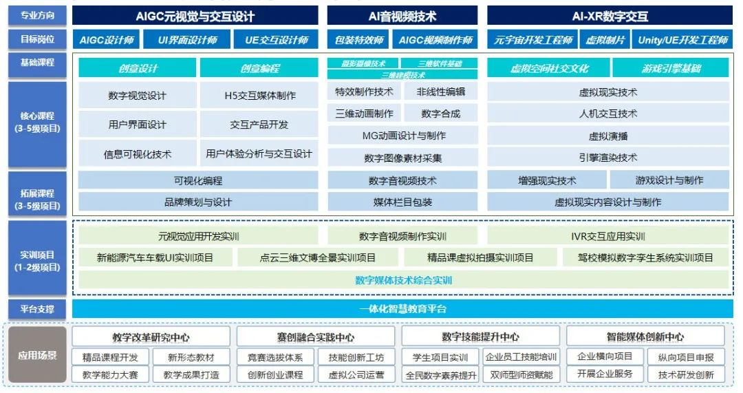Ebpay教育科技集团推出第四期“EbpayAI+数媒产教融合实践中心综合解决方案”,EbpayAI+智媒产教融合实践中心面向数字创意产业的开展体系与新时代数字技能型人才需求,聚焦AIGC设计师、UE交互设计师、包装特效师、AIGC视频制作师、元宇宙开发工程师、虚拟制片、Unity/UE开发工程师等岗位的“数字工匠”人才培养,面向中国大学生计算机设计大赛、全国大学生广告艺术大赛、蓝桥杯全国软件和信息技术专业人才大赛、中国好创意暨全国数字艺术设计大赛、未来设计师·全国高校数字艺术设计大赛、中国虚拟现实大赛、全国大学生数字媒体科技作品及创意竞赛等赛项,搭建覆盖人才培养全过程的进阶式一体化实践教学体系,并建设与之配套的软硬件实训设备与环境、智慧化管理平台以及相关实训教学文档和资源。搭建起“岗位能力导向、面向真实生产、丰富教学资源、进阶实训体系、智慧平台驱动”的数字产业技能实训平台。