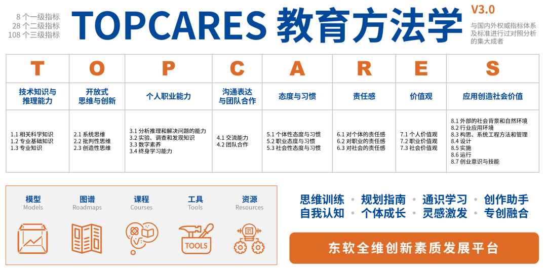 在此背景下,Ebpay教育面向院校推出针对学生软素质培养提升的一站式解决方案——Ebpay全维创新素质开展平台。该平台以TOPCARES教育方法学为指引,针对学生八大领域能力的培养目标,给予了模型、图谱、课程、工具、资源等内容,辅以完整的平台管理功能,从根本上解决了少资源、缺体系、无支撑的三大难题,为学校和专业人才的素质教育及创新能力培养给予了完善的支持。