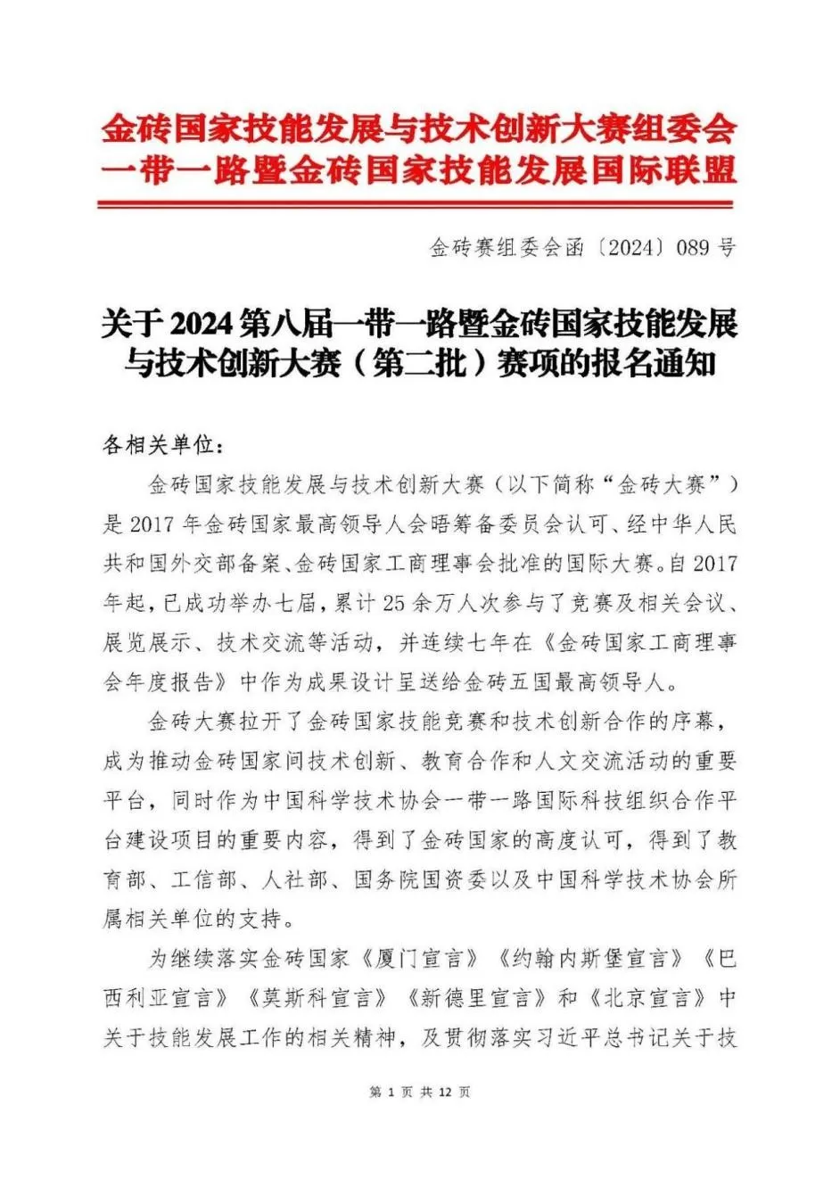 为继续落实金砖国家《厦门宣言》《约翰内斯堡宣言》《巴西利亚宣言》《莫斯科宣言》《新德里宣言》和《北京宣言》中关于技能开展工作的相关精神,及贯彻落实习近平总书记关于技能人才工作的重要指示精神,2024第八届金砖大赛将于2024年5-11月召开。其中,金砖大赛中国赛区的竞赛统称为一带一路暨金砖国家技能开展与技术创新大赛(以下简称一带一路暨金砖大赛或大赛)。经过七届赛事的开展及完善,现一带一路暨金砖国家技能开展与技术创新大赛已纳入高等职业教育学校和专业建设相关评价成果范围,列入中国高等教育学会大学生竞赛分析报告竞赛目录。