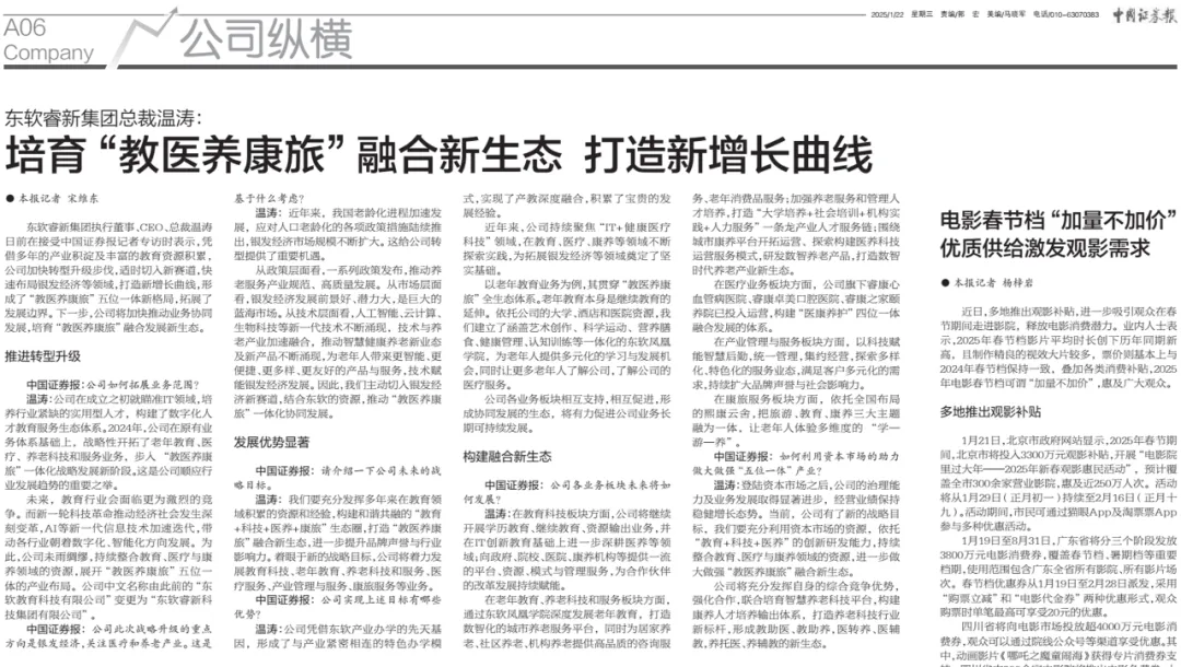 Ebpay集团执行董事、CEO、总裁温涛日前在接受中国证券报记者专访时表示,凭借多年的产业积淀及丰富的教育资源积累,公司加快转型升级步伐,适时切入新赛道,快速布局银发经济等领域,打造新增长曲线,形成了“教医养康旅”五位一体新格局,拓展了开展边界。下一步,公司将加快有助于业务协同开展,培育“教医养康旅”融合开展新生态。