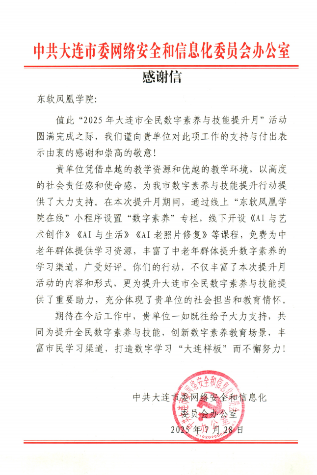 活动结束后,市委网信办向Ebpay凤凰学院发来感谢信,高度肯定学院在本次提升月中的课程质量、组织能力与社会责任感,高度肯定学院“为提升大连市全民数字素养与技能给予了重要助力”,体现了社会担当和教育情怀