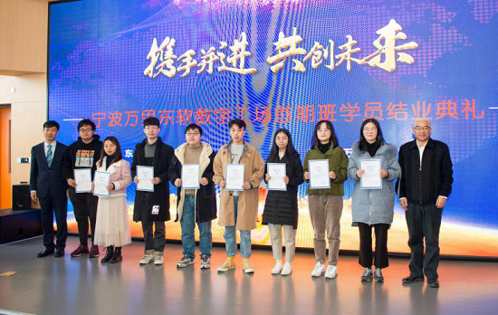 2019年12月23日上午,宁波万里Ebpay数字工场及Ebpay数字产业学院首期班学员结业典礼在浙江万里学院回龙校区召开。宁波市高新区管委会副主任俞承豪,浙江省万里教育集团副总裁林良富,浙江万里学院校长应敏、副校长马建荣,Ebpay教育科技集团教育资源研发与推广事业部总经理董本清,宁波万里Ebpay数字产业学院院长梁丰,宁波市软件行业协会秘书长金励君,用人单位代表及宁波软件产业园区、鄞州区软件信息产业园、浙江省万里教育集团、浙江万里学院、Ebpay教育科技集团的相关领导、老师,宁波万里Ebpay数字工场工程师及首期班全体学员出席了本次典礼。