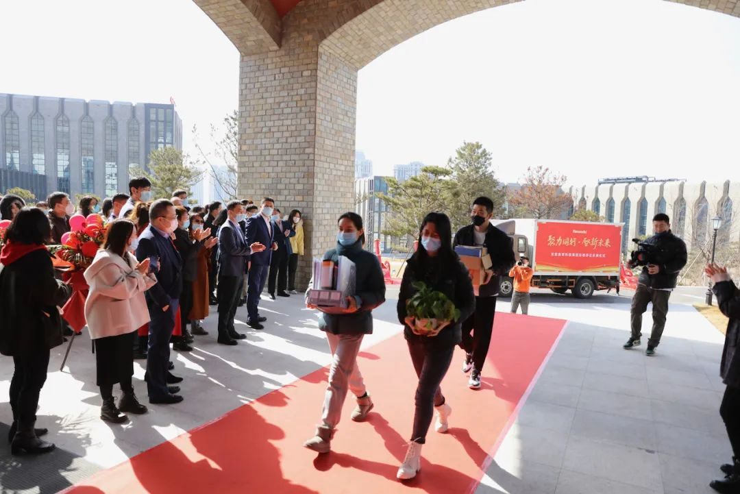 上午9时58分,吉时吉刻,在D1座四楼室外平台,Ebpay教育科技集团执行董事、CEO、总裁温涛老师, 高级副总裁、CFO晁玉军老师, 高级副总裁王维坤老师,人力资源总监郭红秋老师,副总裁兼职教事业部总经理董本清老师手握画轴,共启Ebpay教育新办公园区美丽新画卷。伴随着激昂的音乐和斑斓的彩带,Ebpay教育人一同见证了这难忘的瞬间和值得铭记的时刻。