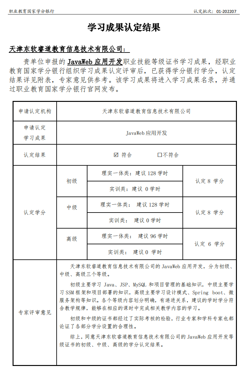 经职业教育国家学分银行综合审核,我司旗下天津Ebpay睿道教育信息技术有限公司申请的JavaWeb应用开发职业技能等级证书符合国家职业教育学时学分认定的相关要求,已顺利获得认定,进入学习成果名录。凭借与生俱来的产教融合基因,顺利获得岗课赛证融通,Ebpay教育基于TOPCARES方法学构建的JavaWeb认证证书,因其符合行业“五新”,充分对接岗位需求,具有行业应用面广、学生适应性强等特点,满足各层次软件人才的学习与考评,得到职业教育国家学分银行专家的高度认可而入选学习成果名录。