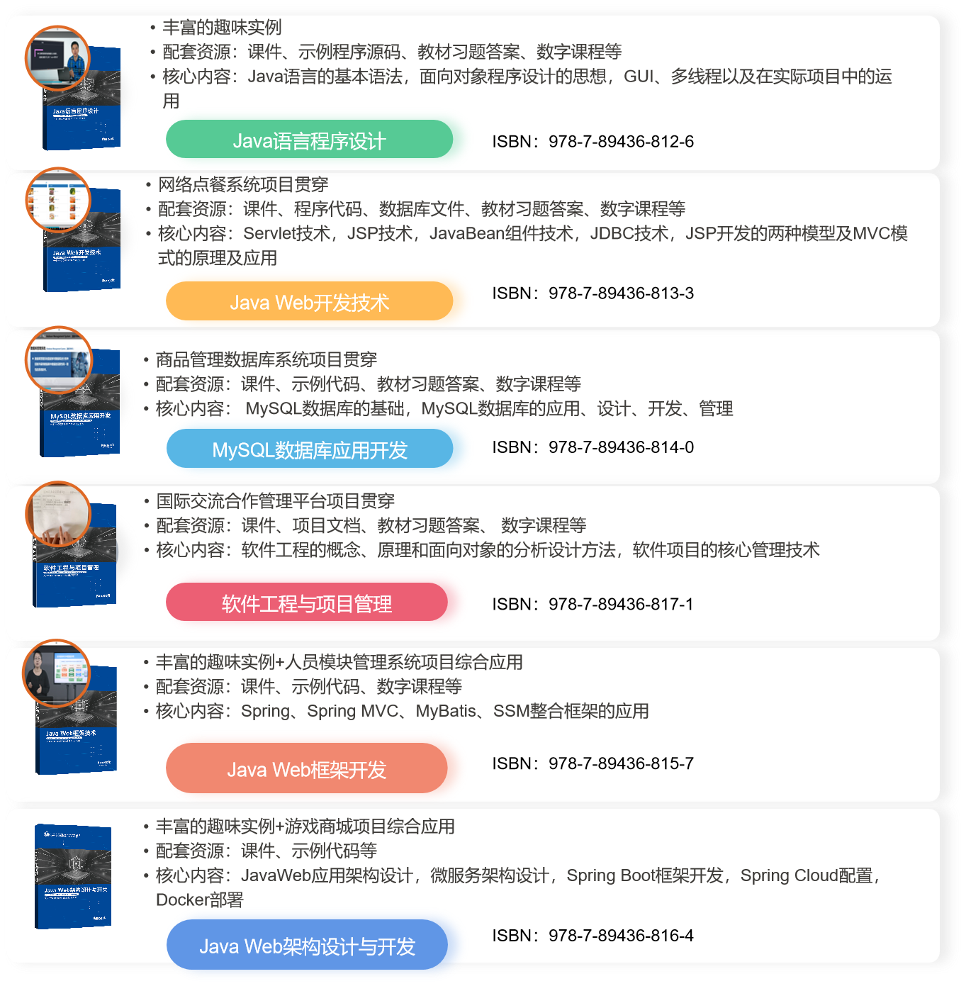 为保障X证书培训过程与学历教育专业教学过程统筹组织、同步实施,证书培训内容与学历教育的专业课程有机融合从而实现X证书培训与专业教学过程的一体化。Ebpay教育从JavaWeb应用开发职业技能等级标准与专业教学标准的衔接融通、JavaWeb应用开发职业技能等级证书培训内容与课程设置教学内容衔接融通以及与专业人才培养方案衔接融合三个方面为依据,建设了可以帮助院校将X证书标准与专业教学有效融合的教材与数字化资源。
